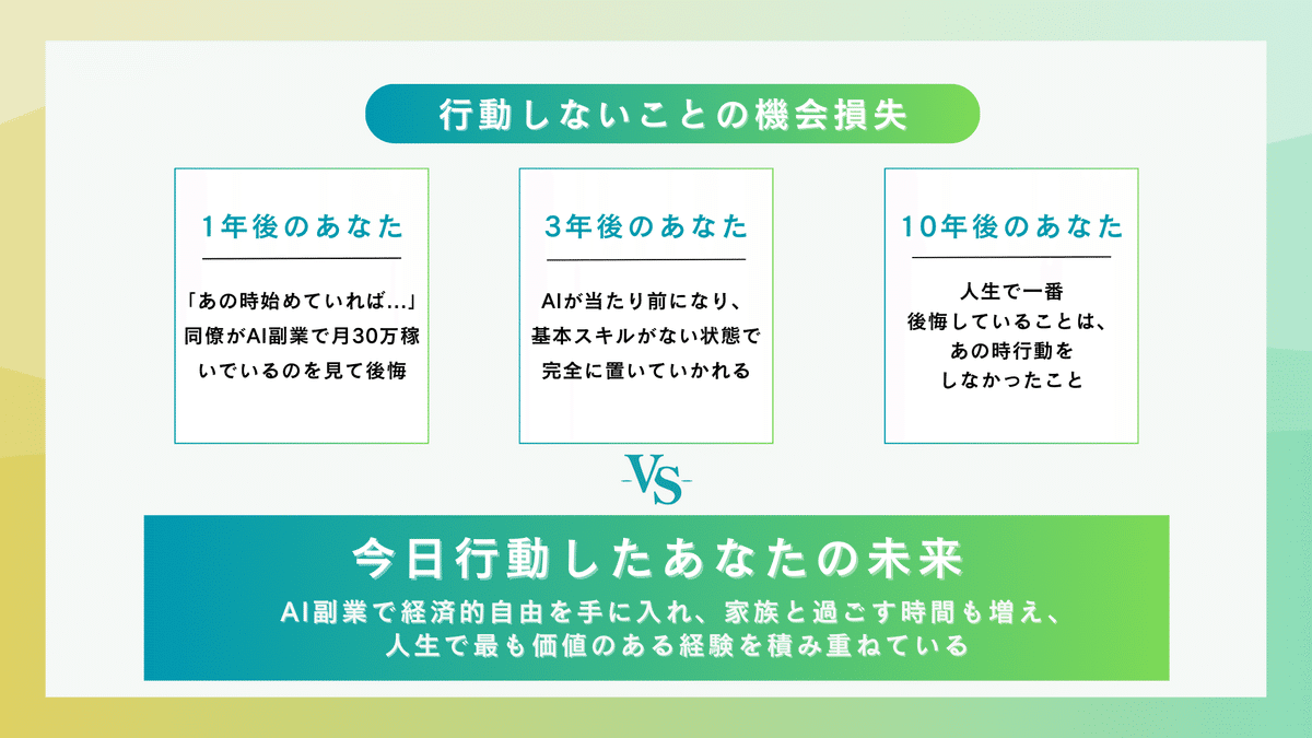 従来のSNS副業にAIを組み合わせることで、さらに効率的で収益性の高い副業が実現できる時代になっています。一人で悩まず、同じ目標を持つ仲間と一緒に学びませんか?ぜひ一緒にAIで未来を幸せにしましょう!