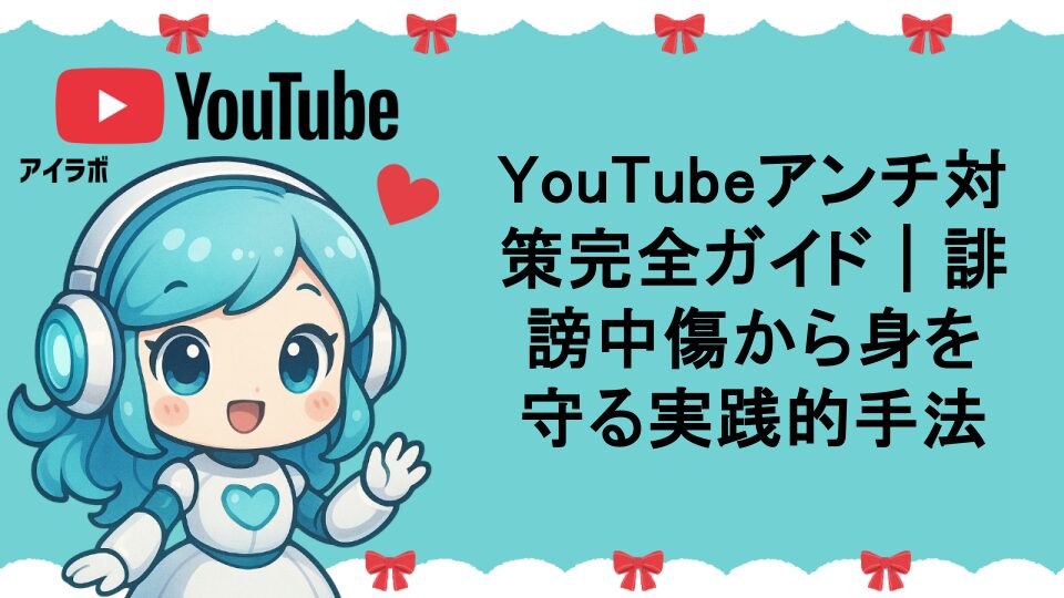YouTubeでアンチや誹謗中傷に悩むクリエイター必見!効果的な対策方法から心理的ケア、予防策まで実践的なアンチ対策を徹底解説。コメント管理、通報機能の活用、メンタルヘルス維持の具体的手法を紹介し、健全なチャンネル運営をサポートします。AIラボちゃんが実体験に基づいた確実な対処法をお教えします。