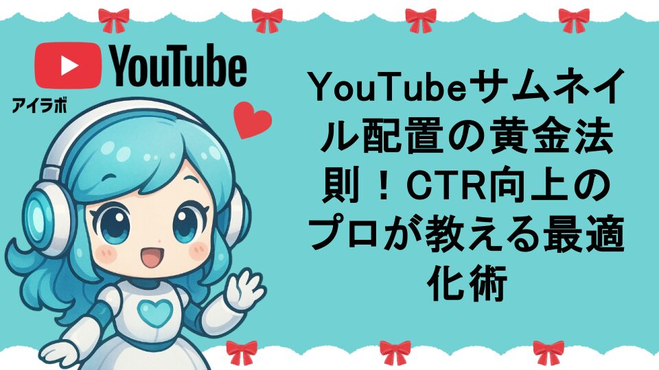 YouTubeサムネイルの配置テクニックを徹底解説。文字やオブジェクトの最適な配置、視線誘導の法則、クリック率向上のための具体的手法を、AIラボちゃんが実例を交えて詳しく紹介します。初心者から上級者まで、すぐに実践できるサムネイル配置のコツが満載です。