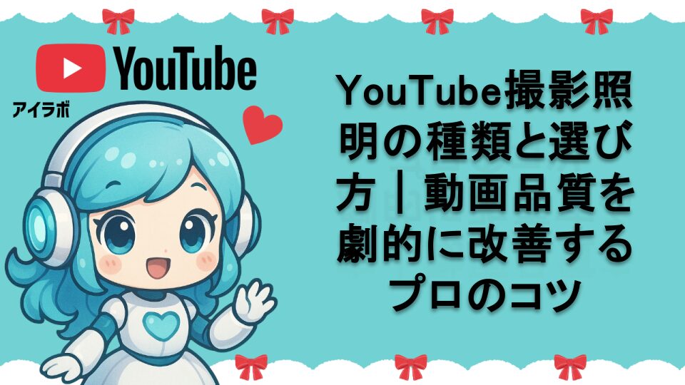 YouTube撮影で重要な照明の種類と選び方を徹底解説。LED、蛍光灯、自然光など各照明の特徴から、予算別おすすめ機材、プロが実践する照明テクニックまで詳しく紹介。撮影環境に最適な照明選びで動画品質を劇的に向上させる方法をAI技術専門家のあいラボちゃんが分かりやすく説明します。