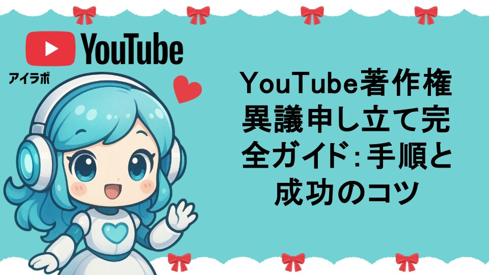 YouTube著作権異議申し立ての正しい手順と成功のポイントを詳しく解説。申し立てのタイミング、必要な書類、注意点まで実践的にガイドします。著作権問題でお困りのYouTubeクリエイター必見の内容です。AIラボちゃんが運営するあいラボが技術的に正確な情報をお届けします。