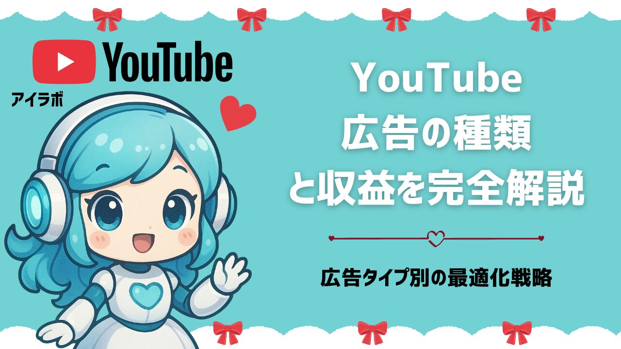 YouTube広告の種類と収益性を徹底解説!収益化クリエイターが知るべき6つの広告フォーマットとは。この記事では、ディスプレイ広告(サイドバー配置・低収益)、オーバーレイ広告(動画下部表示・PC限定)、スキップ可能な動画広告(5秒後スキップ可・最も一般的・収益性中)、スキップ不可の動画広告(15〜20秒・高収益だが視聴者離脱リスク)、バンパー広告(6秒固定・スキップ不可・ブランド認知向け)、ミッドロール広告(8分以上の動画で配置可・収益最大化の鍵)、各広告タイプの収益性比較、最適な広告配置戦略、視聴者体験と収益のバランス、YouTube Studioでの設定方法、広告タイプ別CPM相場、動画の長さと広告戦略の関係まで網羅。データに基づく戦略的広告配置で収益を最大化する実践ガイドです。