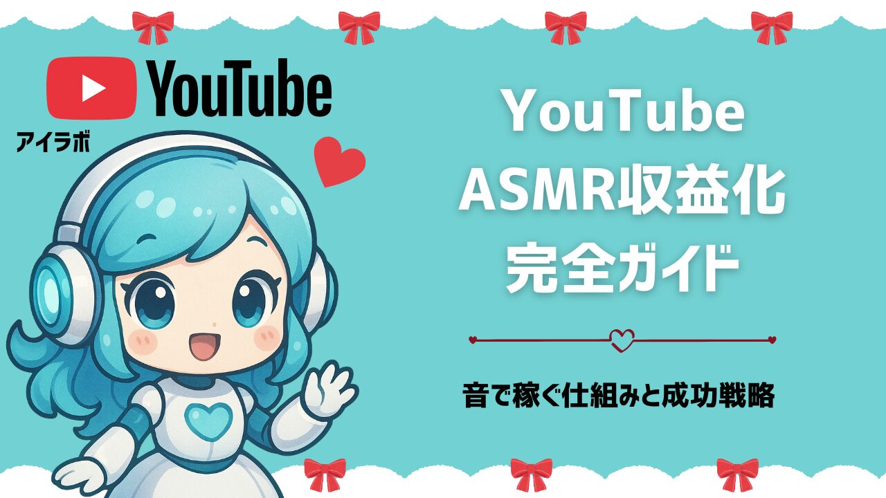 YouTubeASMR収益化の方法を徹底解説!音で稼ぐ仕組みと戦略とは。この記事では、ASMR収益化の基礎知識(YouTubeパートナープログラムの条件・登録者1,000人・総再生時間4,000時間)、ASMRチャンネルの収益化の特徴(高いCPM・熱心な視聴者・長い視聴時間・グローバル展開可能)、5つの主要収益源(広告収入・メンバーシップ・スーパーチャット・企業案件・物販)、収益化を加速する7つの戦略(ニッチ特化・高音質録音・定期投稿・視聴者との交流・SEO対策・複数収益源・ブランド構築)、著作権と音声権利の注意点、収益化の課題(黄色マーク問題・競合増加・機材投資)と対策、成功事例の分析まで網羅した実践ガイドです。