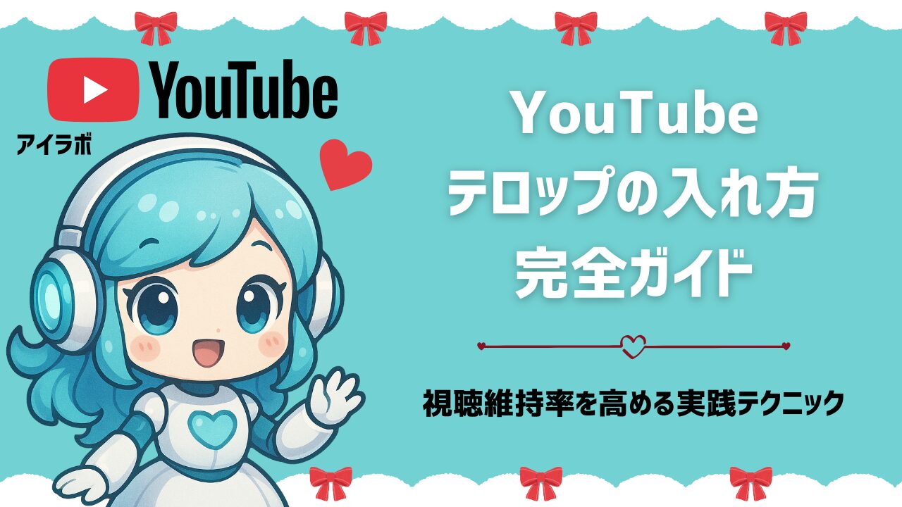 YouTube動画にテロップを効果的に入れる方法を徹底解説!テロップは視聴維持率を30%以上向上させる重要要素です。この記事では、DaVinci Resolve・Adobe Premiere Pro・CapCut・iMovie別の具体的な入れ方手順、視認性の高いフォント選び(ゴシック体・太字推奨)、読みやすい色の組み合わせ(白文字+黒縁取りが最強)、最適な文字サイズ(画面高さの10%目安)、配置位置(下部3分の1が基本)、表示タイミング(1秒あたり4文字の読速度)、アニメーション効果の使い方、全画面テロップ・強調テロップ・説明テロップなど種類別の実例、テンプレート活用による効率化、文字が小さい・多すぎる・タイミングが悪いなどの失敗回避まで網羅した実践ガイドです。